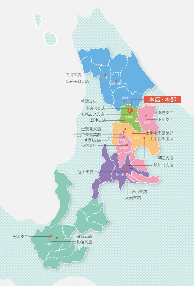 | 名寄市、士別市、旭川市、札幌市、石狩市、江別市、北広島市、恵庭市、千歳市、 深川市、滝川市、砂川市、美唄市、三笠市、岩見沢市 上川郡(下川町、剣淵町、和寒町、比布町、鷹栖町、東神楽町、当麻町、東川町) 中川郡(美深町、音威子府村、中川町) 天塩郡(幌延町、天塩町) 枝幸郡(中頓別町、枝幸町) 空知郡(奈井江町) |